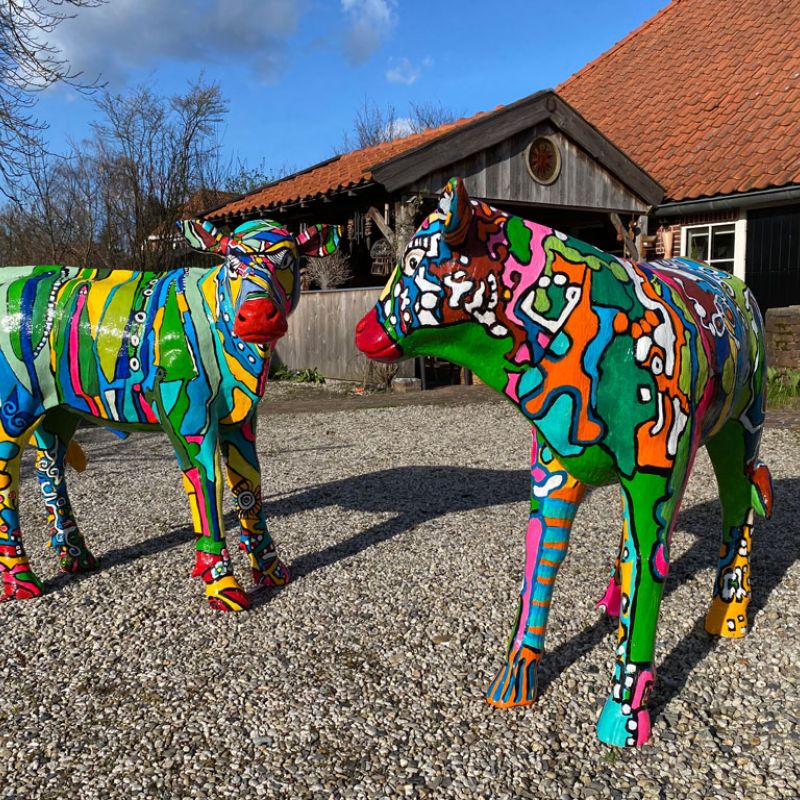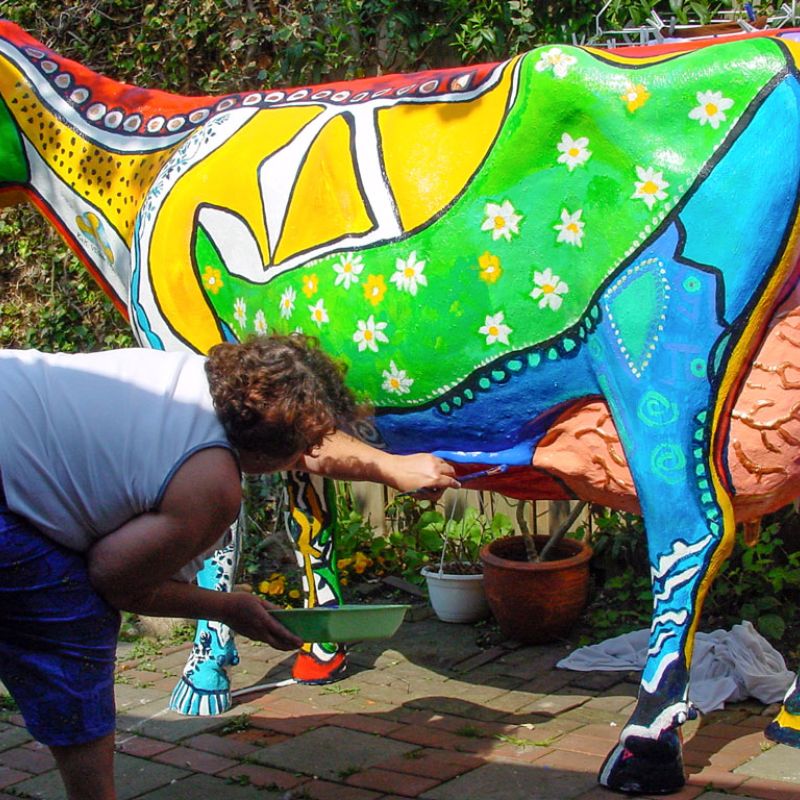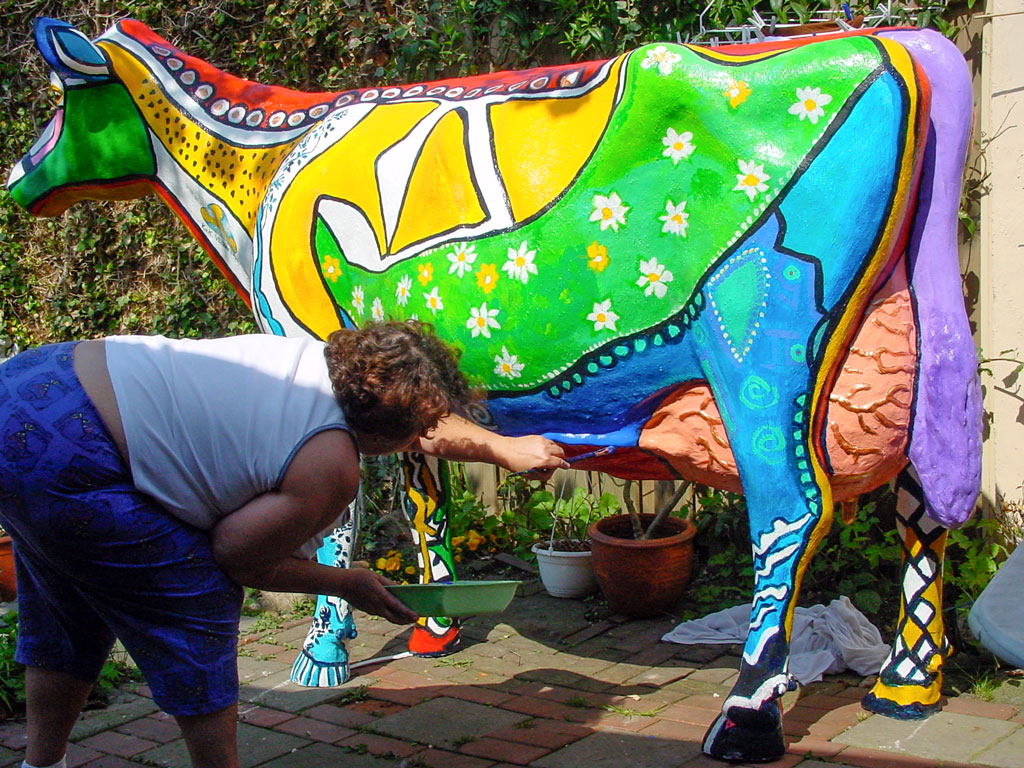 Und wenn sie spontan Lust auf etwas anderes hat, dekoriert sie mit Begeisterung einen Stuhl, einen Tisch oder eine Polyesterkuh.