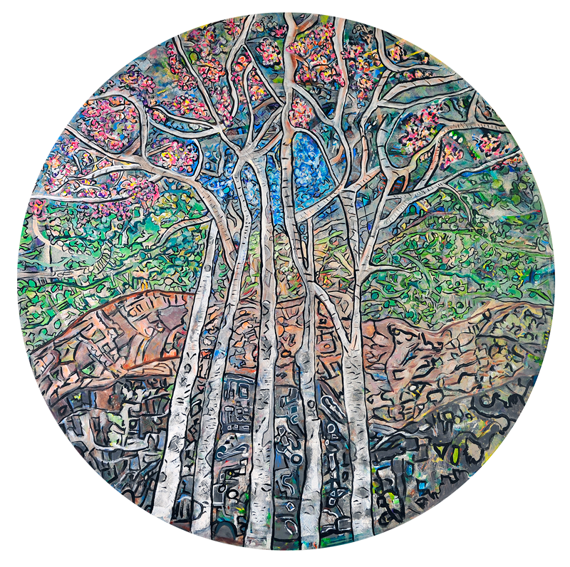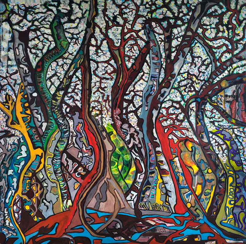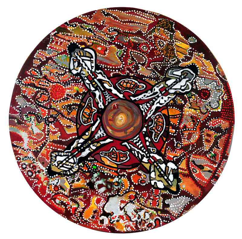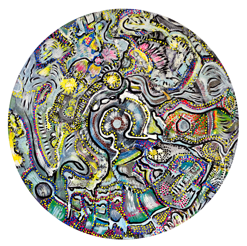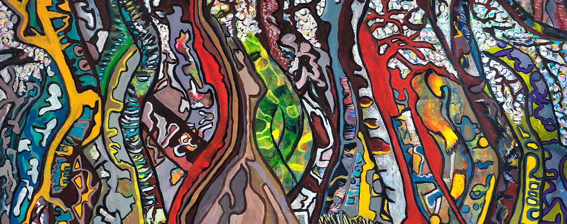 The center piece measures 290 x 150cm. Acrylic on canvas.