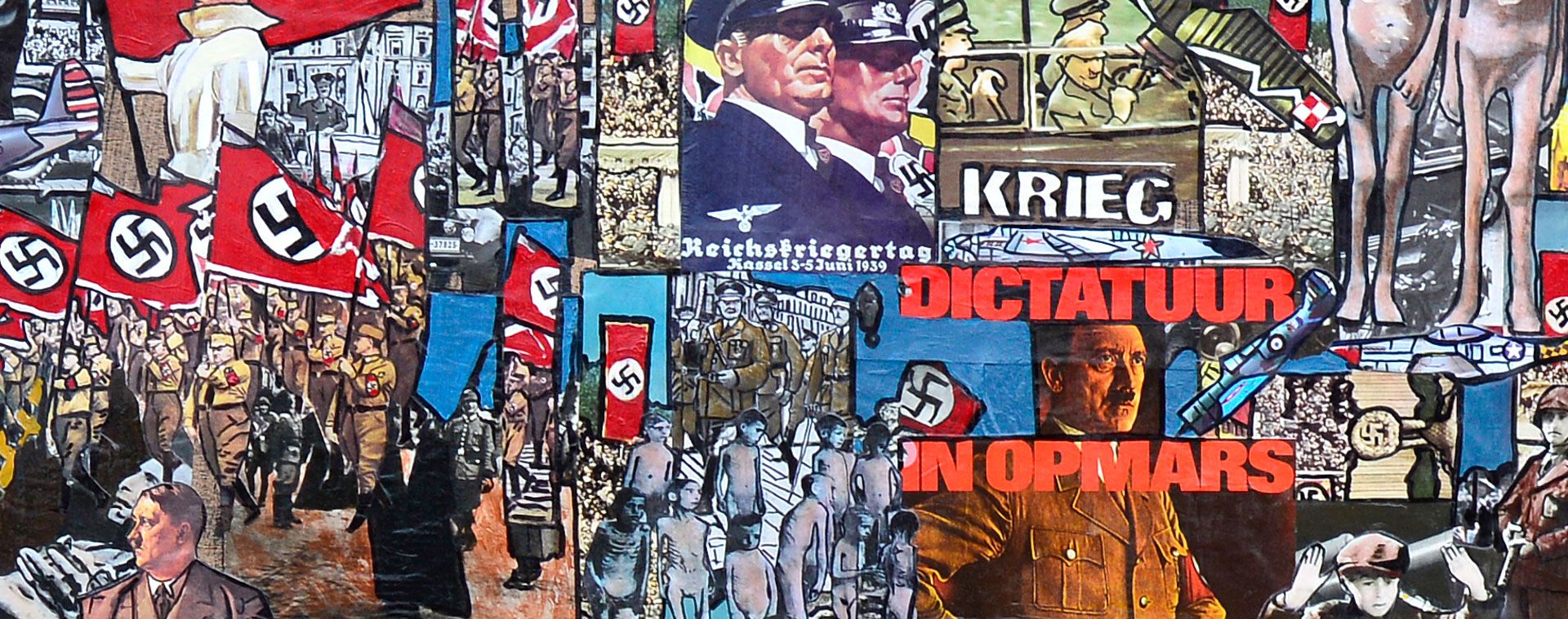 Een meer dan indrukwekkend, levensgroot, perfect gemaakt schilderij over "nooit meer" oorlog en de gruweldaden van zo'n conflict. De afmeting is 390 x1 50 cm. Acryl op doek. Door dit gigantische werk zal iedereen die ernaar kijkt de waarde van onze vrijheid inzien. Dit prachtige doek is nu als drieluik te koop.